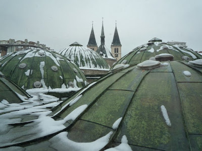 | Sarajevo's cathedral can be seen peeking above the roof of the Bosniak Institute. Sarajevo has a long history of religious tolerance. |